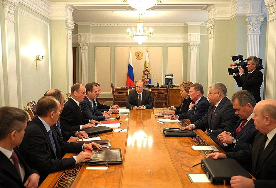 Sastanku ruskog Vijeća za nacionalnu sigurnost su, uz predsjednika Vladimira Putina, nazočili ruski premijer Dmitrij Medvedev, predsjednici oba doma parlamenta Valentina Matvijenko i Vjačeslav Volodin, čelnik uprave Kremlja Anton Väinö, tajnik Vijeća sigurnosti Nikolaj Patrušev, ministar vanjskih poslova Sergej Lavrov, ministar unutarnjih poslova Vladimir Kolokolcev, ministar obrane Sergej Šojgu, kao i posebni predstavnik predsjednika za pitanja zaštite okoliša, ekologije i transporta Sergej Ivanov.