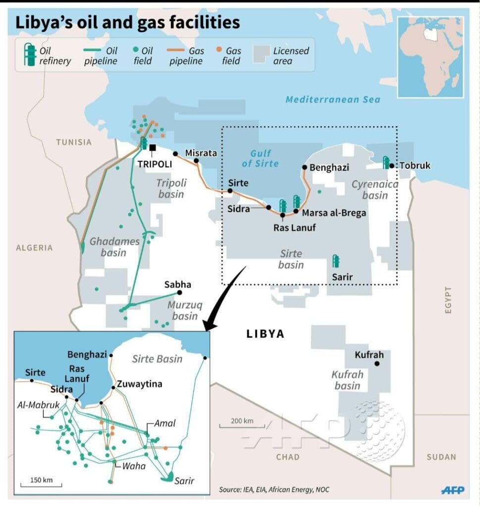 Libijska narodna armija pod vodstvom generala Kalife Haftara surađuje s vlastima na istoku Libije i prethodno je od islamista oslobodila naftne luke 2016. Kasnije je naftna infrastruktura postala dio libijske nacionalne naftne kompanije NOC i zemlja je nastavila izvoziti naftu i za to dobivati novac.