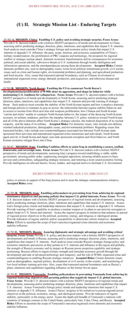 U dokumentu “Lista strateških misija” (US SIGNT 2007. Strategic Mission List) opisuje se 16 “tematskih prioriteta” za zemlje koje su nadzirane “zbog terorizma, utjecaja na američku nacionalnu sigurnosti i posjedovanja oružja za masovno uništenje”.