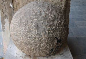 gledao sam vise slika. nisu kugle kao ova na slici ovdje nego okruglasto kamenje. mislim da je takvo najpogodnije za precizno bacanje. vjerojatno da se radi o skladistu steljiva. kao sto djeca naprave bunker od snijega a onda pripreme gotove grude. moguce da se istovremeno koristilo i kao alat, cekic. moguce da uvjezbani strelac ima najbolju preciznost ako baca kamen oblika i tezine na koji je navikao. moguce da okruglasto kamenje ima vecu udarnu moc. “kugle” su velicine da mogu stati u saku.