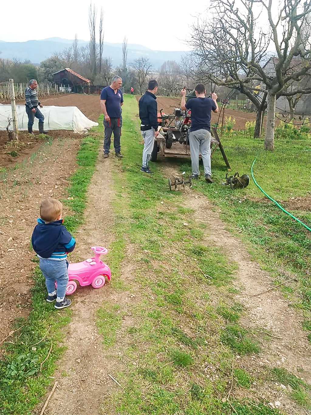 Doista braća Paradžici su tu. Nevista, sinovi i dica, ali i mali unučići koji su tek prohodali. Sjede na brazdi kamene zemlje, a pokraj njih mali plastički traktorčić. Gledaju kako stari kopaju, ne znajući da postaju ljudi kamenih gena.