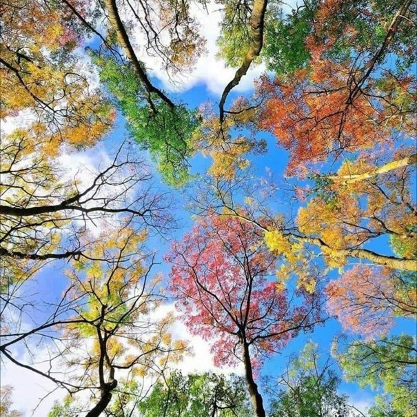 Onda zaboravim na tu sliku, a Lucija već objavi novu i ponovo me isprovocira. To je fotografija jeseni viđena iz posebnog ugla, na posebnom mjestu, gdje se na nebu ocrtavaju krošnje s različitim bojama lista. Napisao sam ovako: