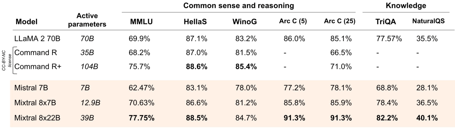 Statistički gledano, Mixtral 8x22B nadmašuje mnoge postojeće modele. U izravnim usporedbama na standardnim industrijskim mjerilima – u rasponu od zdravog razuma, zaključivanja do znanja o predmetu – Mistralova nova inovacija briljira. Brojke koje je objavio Mistral AI pokazuju da Mixtral 8x22B značajno nadmašuje model LLaMA 2 70B u različitim lingvističkim kontekstima kroz kritičko razmišljanje i mjerila znanja: