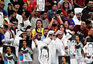 Nogometni navijači u Kataru kritizirali su Njemačku tijekom utakmice protiv Španjolske u nedjelju navečer, nakon što su bili viđeni su kako pokrivaju usta i mašu posterima pobjednika Svjetskog prvenstva Mesuta Özila. Prosvjedujući protiv odluke FIFA-e o zabrani kapetanu Manuelu Neueru nošenja kapetanske trake ”One Love” oko ruke, njemački igrači prekrili su usta za svoju momčadsku fotografiju uoči prve utakmice protiv Japana ranije na prvenstvu. Neki su navijači na tribinama Al Bayta organizirali prosvjed osvete u nedjelju, a neki su viđeni kako hodaju okolo prekrivenih usta i mašu slikama bivše njemačke zvijezde Özila. Özil se povukao iz međunarodnog nogometa nakon ranog odustajanja Njemačke od Svjetskog prvenstva u Rusiji 2018., optuživši nacionalne medije da su ga učinili žrtvenim jarcem i sugerirajući da je bio izložen rasizmu zbog svojih turskih korijena; uključujući i Njemački nogometni savez (DFB).