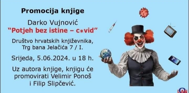 Promocija knjige Darka Vujnovića “Potjeh bez istine (c*v*d)” održat će se u Društvu hrvatskih književnika, Trg bana Josipa Jelačića 7/1, u srijedu 5. lipnja u 18 sati.