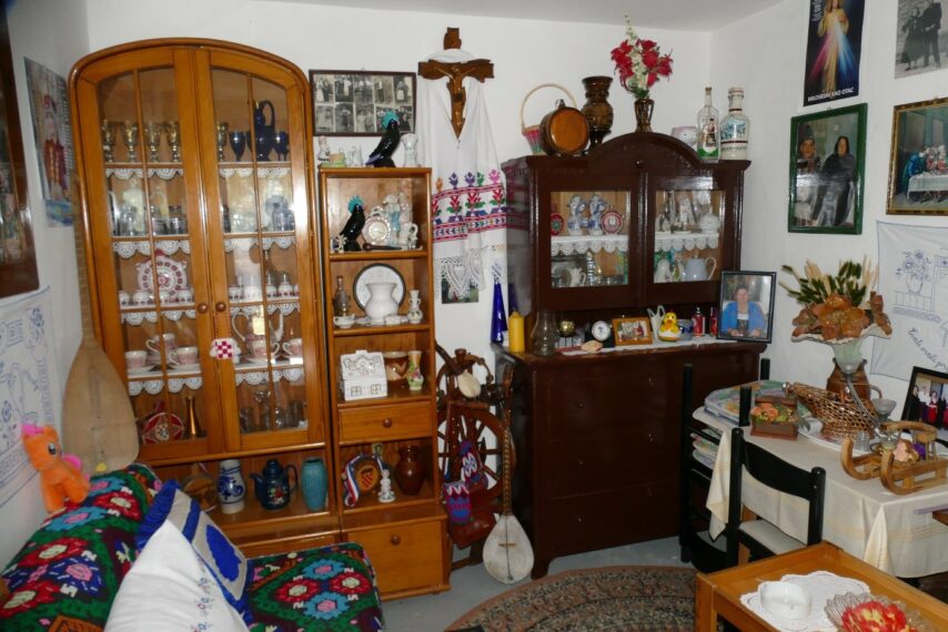 I stari namještaj zauzima značajno mjesto u ovom „muzeju“. Krevet, i to namješten „po starinski“, ormari, sinija s klupčicama koja je služila za objede… Tu je i kofer koje su mladići prije nosili kada su odlazili na odsluženje vojnog roka, okviri sa starim fotografijama koje su opleli šibama ovdašnji korpari i nezaobilazna šivaća mašina marke Singer. Zatim posuđe, od drvenih naćvi u kojima se mijesio kruh do nešto mlađih kofa za pijaću vodu s pripadajućim kutlačama kojima se voda grabila iz kofa, a tu su i limeni tanjuri.