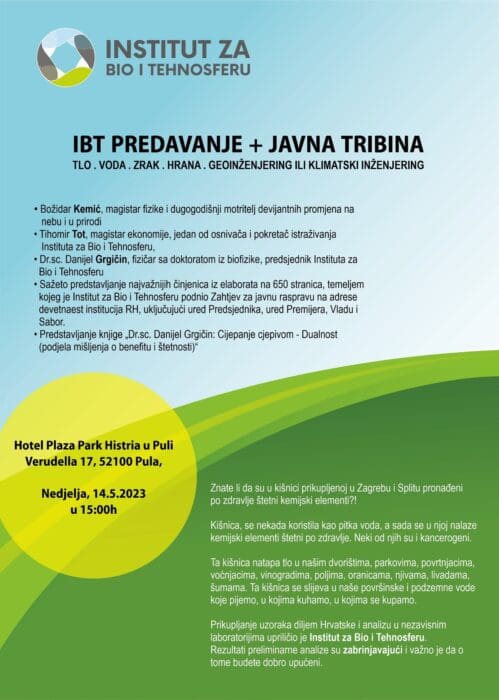 Dragi čitatelji sve vas u nedelju 14.05.2023. pozivamo u Hotel Plaza Park Histria u Puli gdje ćete od 15 sati moći prisustvovati dvama događajima u organizaciji Instituta za Bio i Tehnosferu. Autor dr. sc. Danijel Grgičin će predstaviti svoju knjigu Cijepanje cjepivom – Dualnost (podjela mišljenja o benefitu i štetnosti) dok će vas Božidar Kemić magistar fizike i Tihomir Tot magistar marketinga više upoznati sa tehnološkom problematikom kojom se bavi institut, a to je zagađenje kišnice.