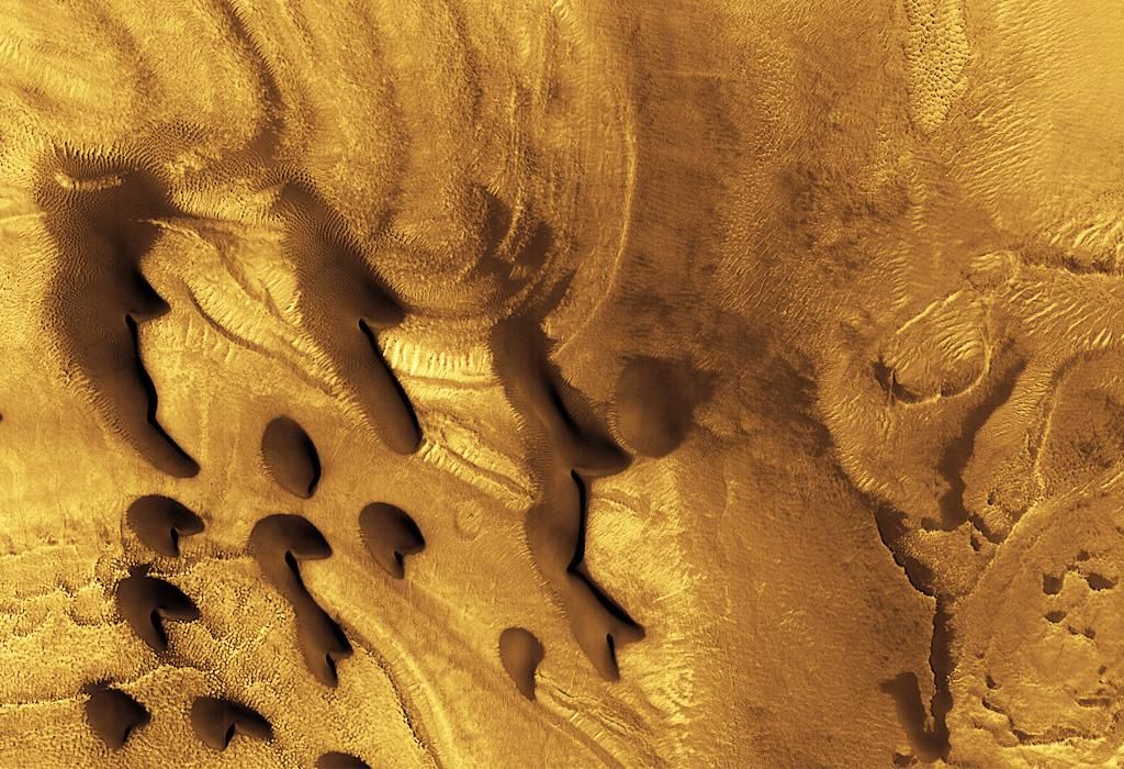 Slike Marsa prikazuju jezive pješčane formacije na crvenoj planeti. Crno-bijele fotografije koje je snimila HiRISE kamera na Mars Reconnaissance Orbiter (MRO), prikazuju područje od pet kilometara kratera od udara u regionu Nilosirtis, sa dinama isprekidanim svuda. Istraživači kažu da su se dine pojavile nakon što je vjetar unio pjesak u region sa okolnog terena.